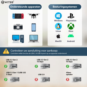Let op: De snelheid van de behuizing wordt bepaald door de overdrachtssnelheid en specificaties van jouw M.2 SSD. Gebruik je een oudere USB-versies (zoals USB 3.0 of USB 2.0), dan kan de snelheid aanzienlijk lager uitvallen.