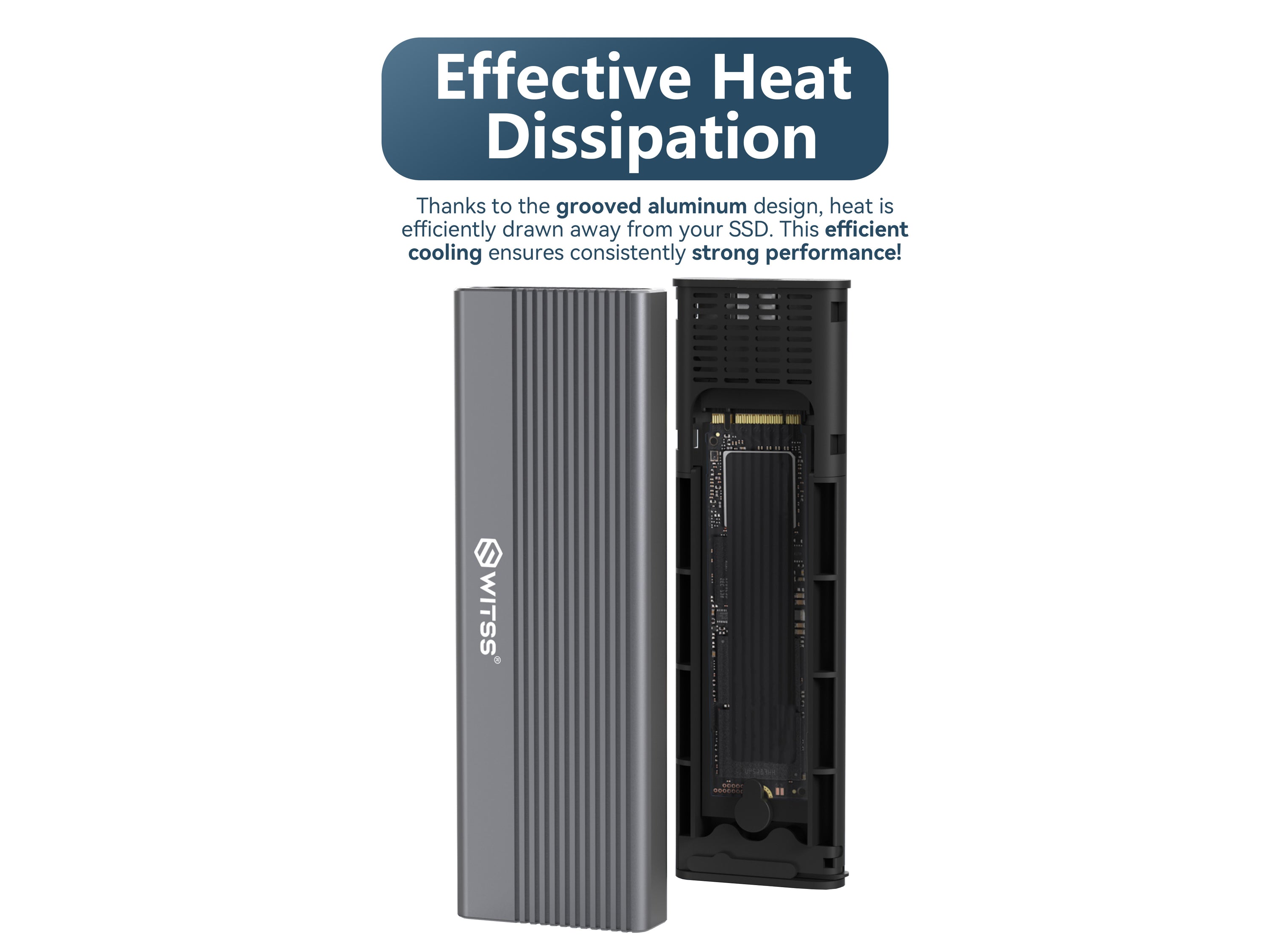 De aluminium behuizing is voorzien van een geïntegreerde heatsink en thermische koelstrip. Dit zorgt voor een efficiente koeling van de SSD wat resulteert in een constante sterke prestatie!