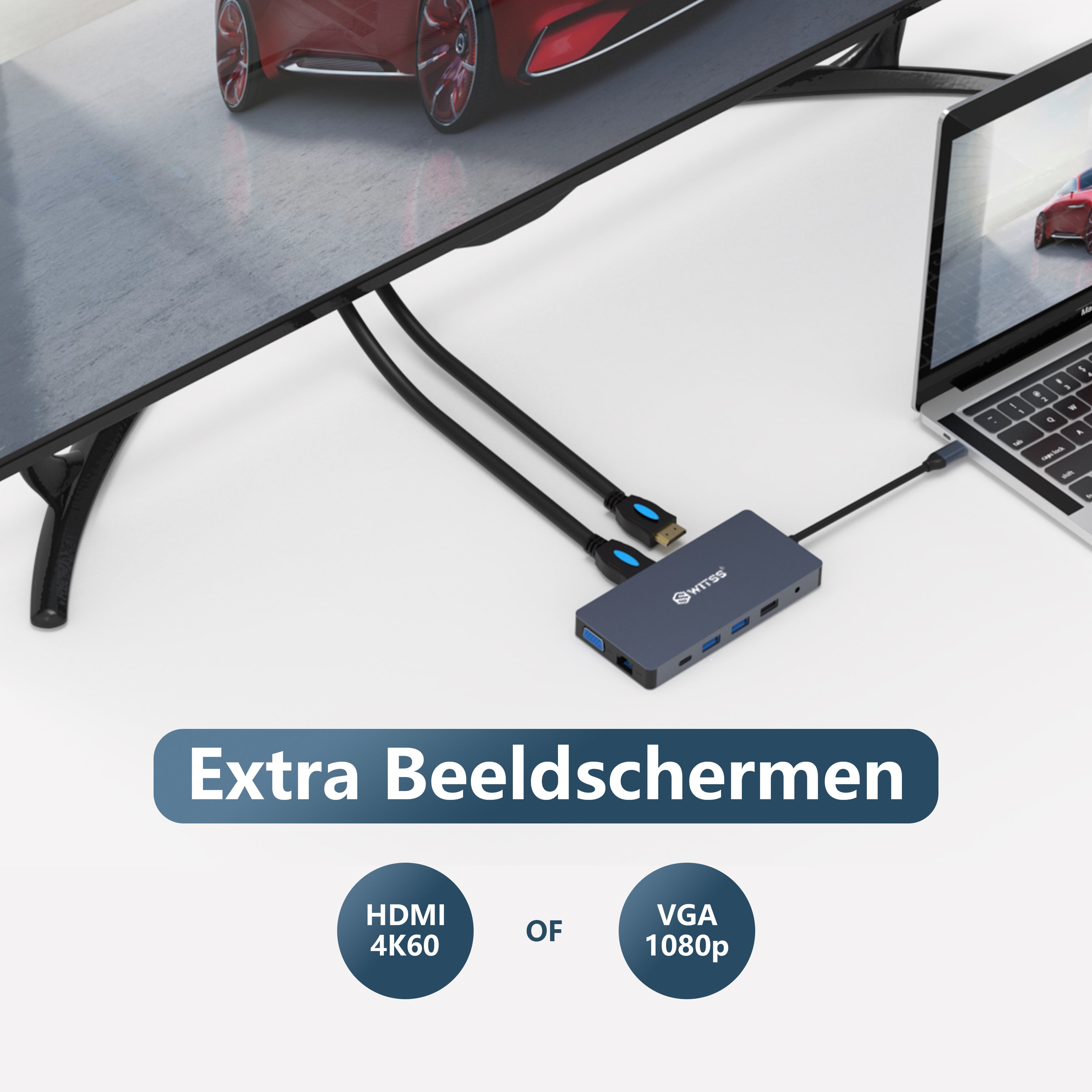 | 2x HDMI (4K@30Hz) + 1x VGA (1080@Hz) | Sluit tot drie extra schermen aan |