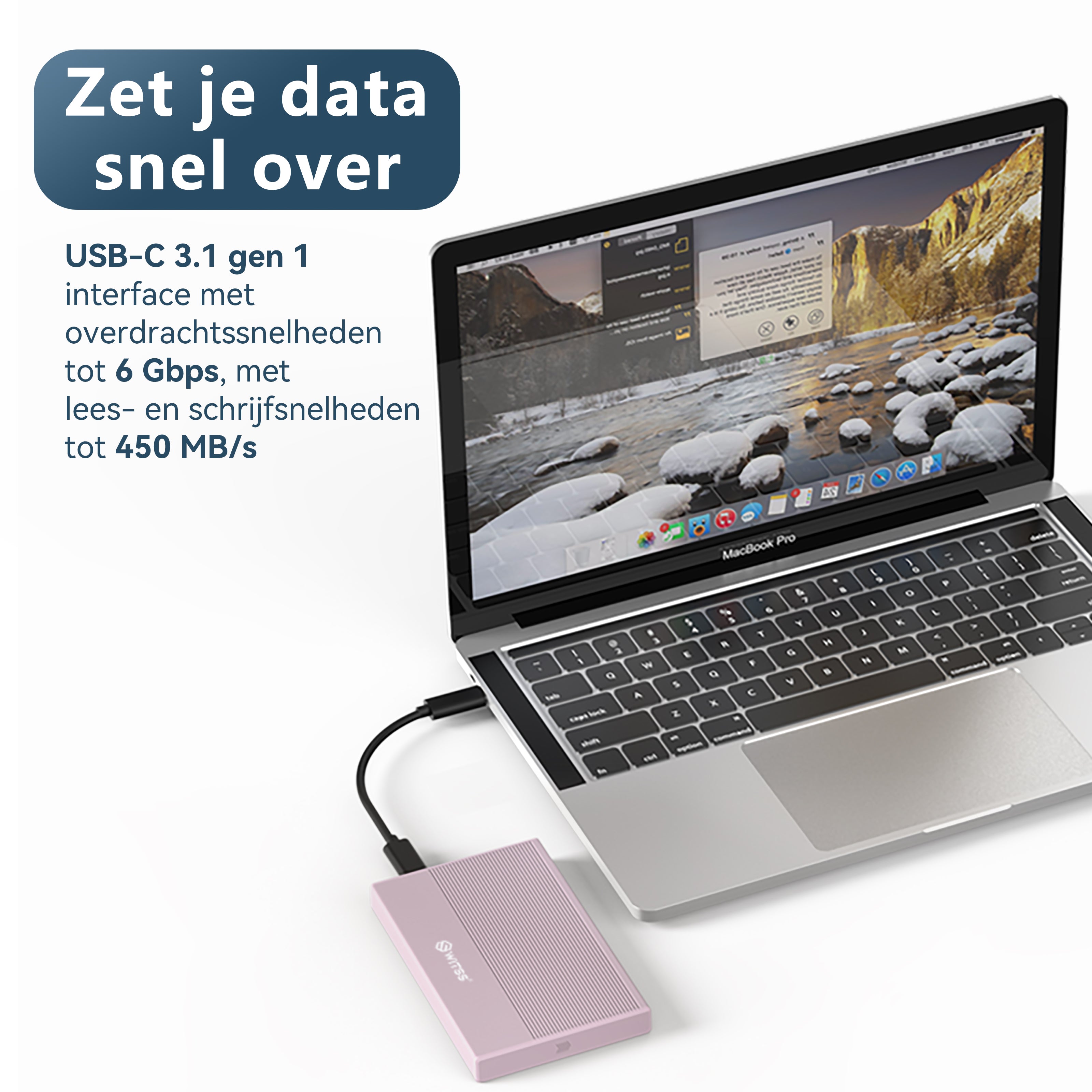 De USB-C 3.1 Gen 1-poort ondersteunt overdrachtssnelheden tot 6 Gbps, met lees- en schrijfsnelheden tot 450 MB/s. Dat betekent dat je een bestand van 1 GB al binnen enkele seconden overzet naar je laptop, desktop of gameconsole.