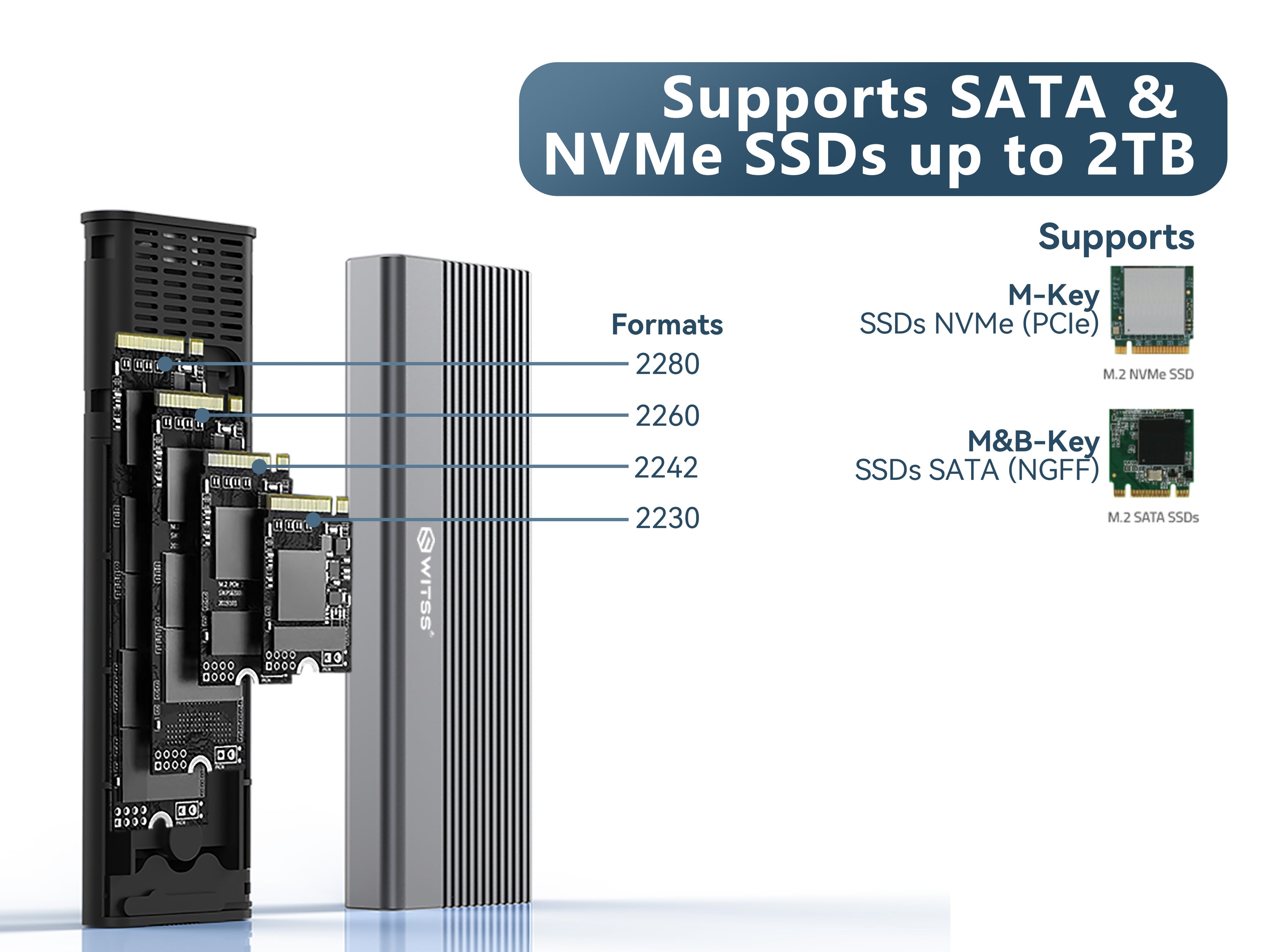 Deze behuizing ondersteunt zowel NVMe (PCI-E) als SATA (NGFF) M.2 SSD’s, met M-Key of M+B-Key aansluiting. Geschikt voor formaten 2230, 2242, 2260 en 2280, ondersteunt tot 2 TB opslagcapaciteit.