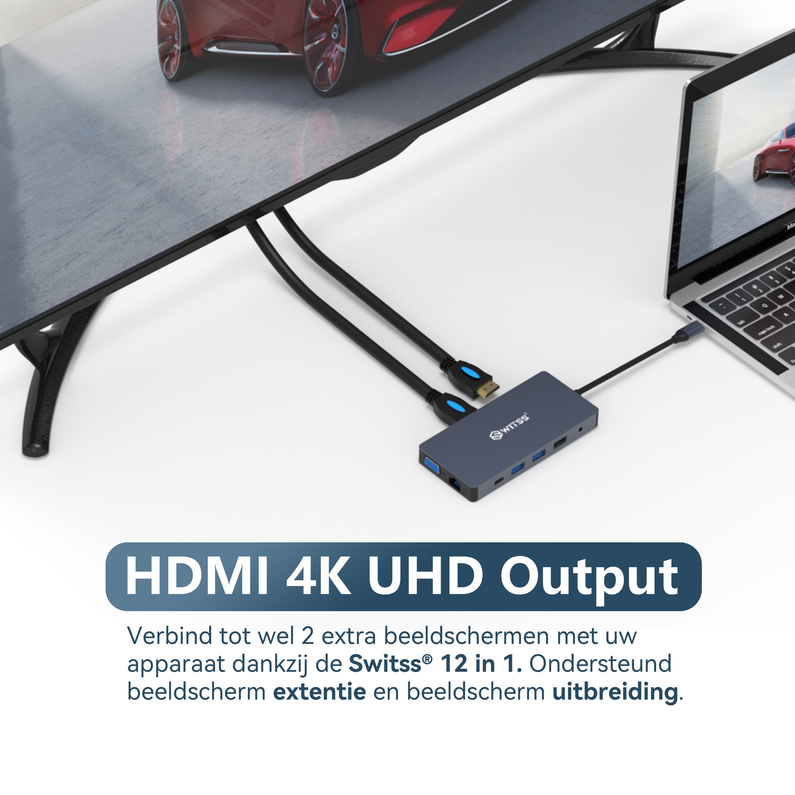 Wil je meer poorten voor je laptop of desktop en tegelijkertijd je werkplek optimaliseren? De Switss®USB-C Hub 12-in-1 biedt een complete oplossing in één compact dockingstation. Dankzij het compacte formaat neem je hem eenvoudig overal mee naartoe, terwijl je profiteert van hoge overdrachtssnelheden via USB-C, USB of Thunderbolt.