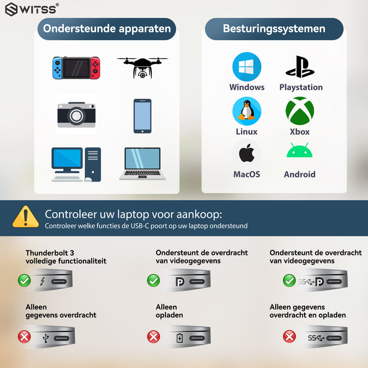 Let op: macOS ondersteunt meestal slechts één extern scherm via USB-C. Uitbreiding naar meerdere schermen werkt volledig alleen op Windows.